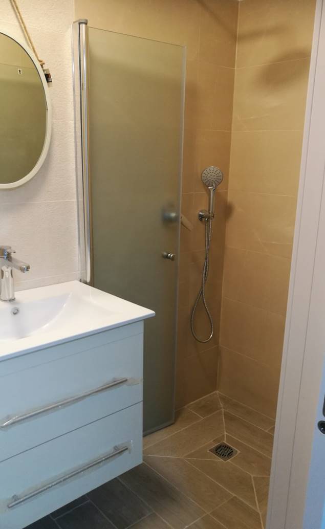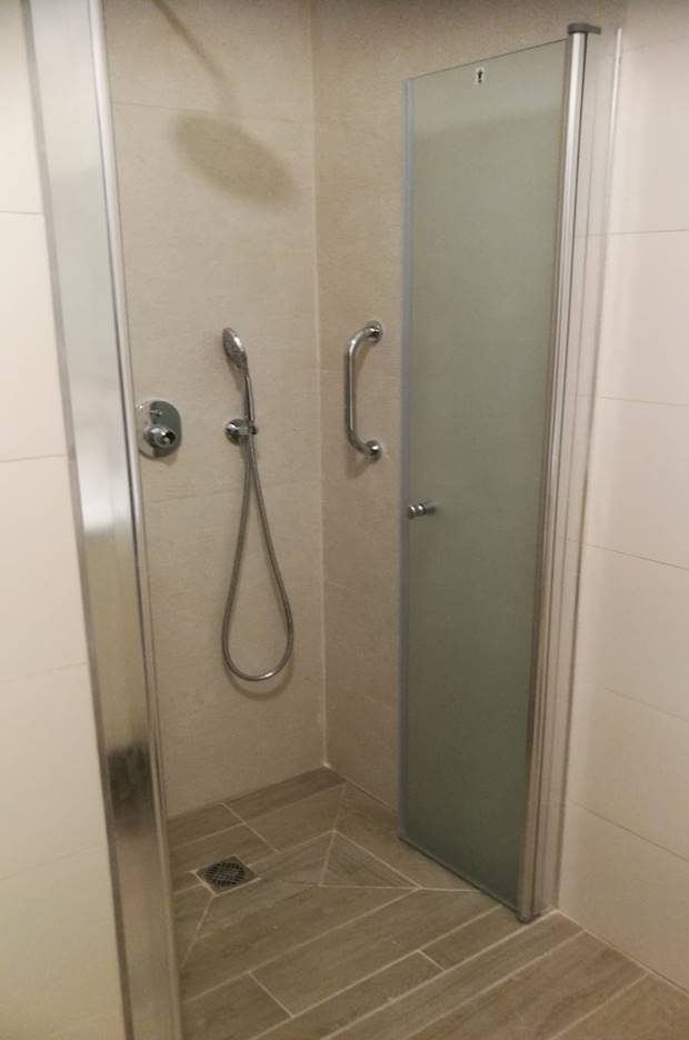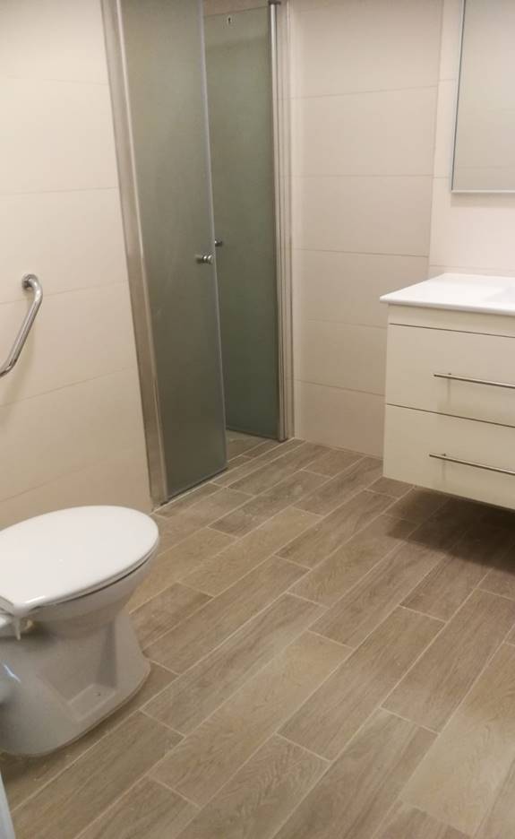 חדר רחצה נגיש כולל מאחזי יד,מקלחת רחבה למעבר חופשי של כיסא גלגלים.