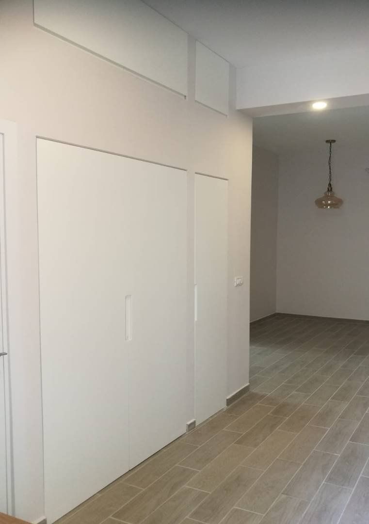 בכניסה לבית יצרנו ארונות קיר לטובת תליית מעילים ואחסון נעליים. הארון הגדול לצידו מכיל מכונה ומייבש כביסה.